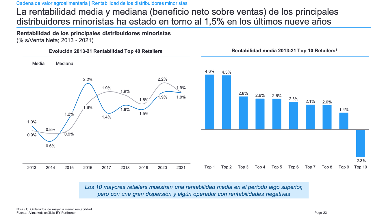 De hecho, si analizamos los resultados de las diez principales cadenas vemos que, en el caso de la que obtiene un mejor desempeño, sus ganancias apenas llegan al 4,6% de la facturación anual. No se sostiene, pues, el relato del gobierno y de la izquierda política y mediática, que insiste en dibujar un escenario apocalíptico en el que los supermercados engordan sus márgenes a costa de los consumidores y los proveedores. Nada más lejos de la realidad. Las cifras ponen de manifiesto la compleja situación del sector y desmontan por completo este relato.