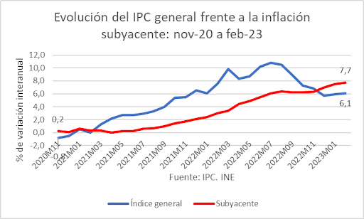 La subida constante de precios desde noviembre de 2020 puede que haya tenido algún falso llano, pero la tendencia sigue siendo alcista, cobrando este mes especial intensidad. De esa forma, en febrero, el IPC general se situó en el 6,1% interanual -dos décimas más que en enero, pese a partir de una comparación con un mes en el que había ya elevada inflación, como era febrero del pasado año. Sin embargo, lo más preocupante es la evolución de la subyacente, que sube otras dos décimas y crece hasta el 7,7% interanual, de manera que la inflación más preocupante, la más estructural, que es la subyacente, sigue creciendo, tras cruzarse con el índice general, que muestra cómo el alza de precios se ha enroscado de manera muy importante en toda la cadena de valor.