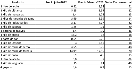 Si el IPC está subiendo un 6,1% interanual, con un 7,7% de subyacente, y los alimentos están por encima de un 15% de incremento, los productos básicos del día a día, en los supermercados, han subido mucho más desde el verano, con incrementos en el precio de la leche de hasta el 61%; un 14,3% en las naranjas; un 44% en los tomates; un 36% en los huevos; un 11% en el pan; un 20% en la carne; hasta un 40% en el pescado; o un 84% en el aceite de oliva, por poner unos ejemplos.