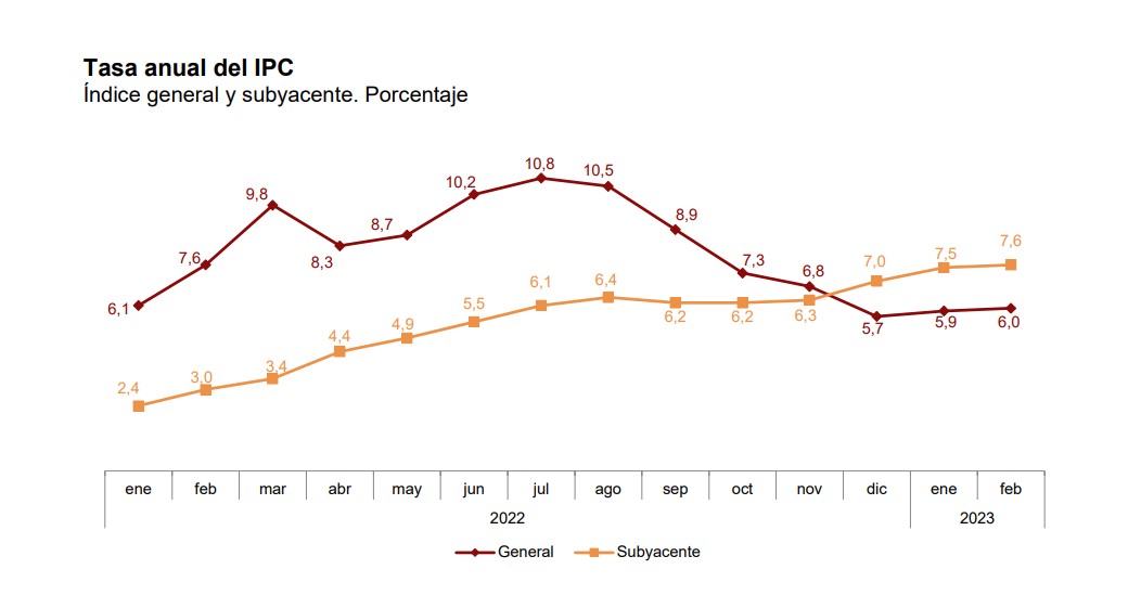 Con la subida registrada en el segundo mes de 2023, la inflación encadena dos meses consecutivos de ascensos en su tasa interanual tras el repunte de enero, cuando se incrementó dos décimas, hasta el 5,9%.