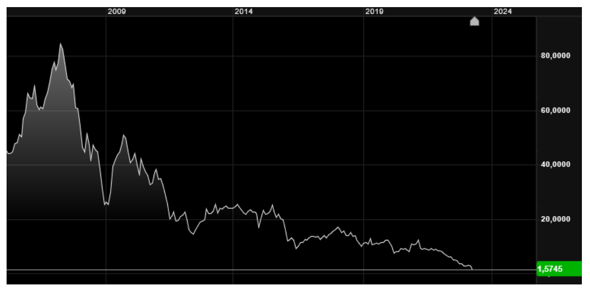 Nada más visual que este gráfico de largo plazo de la cotización del banco Credit Suisse en la bolsa suiza, para entender que los problemas de este banco no surgen a raíz de la crisis del SVB estadounidense.