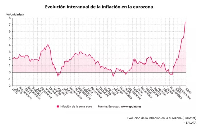 Pero lo que estamos viendo es una rápida subida de los tipos de interés con un nulo interés por la llegada de la recesión. Los tipos de interés suben, en EEUU y en Europa, pero en Europa, mientras suben, a menor ritmo que en EEUU, se sigue inyectando liquidez en las economías periféricas como la Española mediante la aprobación de los famosos planes de ayuda Next Generation y la compra de deuda por parte del BCE. Por lo tanto, el consumo no se frena, y la economía sigue creciendo obligando a los bancos centrales a seguir endureciendo sus políticas de subidas de tipos.