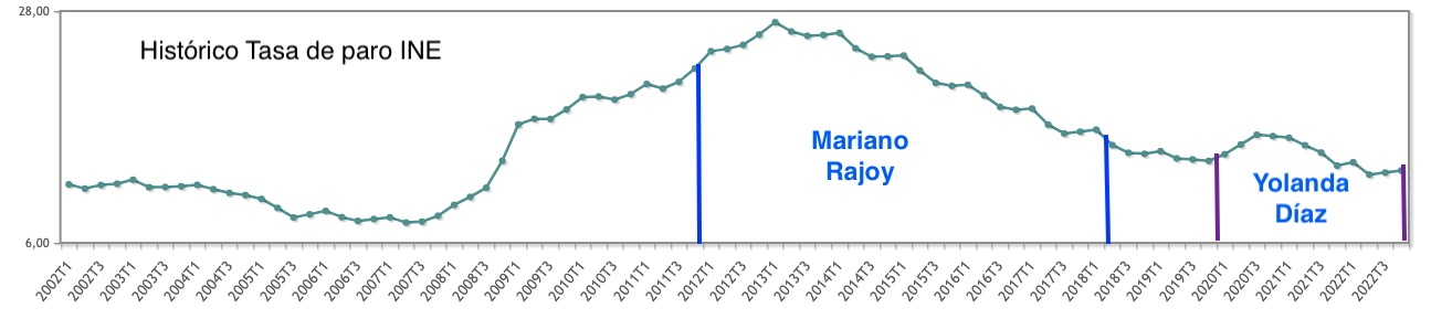Es decir, que lo que no contó Yolanda Díaz es que Mariano Rajoy cogió un país con el 26,9% de paro y lo dejó en el 15,28%. Cuando Yolanda Díaz tomó las cartera de Trabajo en enero de 2020, cuando la tasa de paro era del 14,41%, logró llevarla hasta el 16,26% y luego, tras distintos cambios en el INE y su reforma laboral que cambia la nomenclatura y esconde a otro medio millón de parados bajo la alfombra de los fijos discontinuos, lo tiene en el 12,87%.