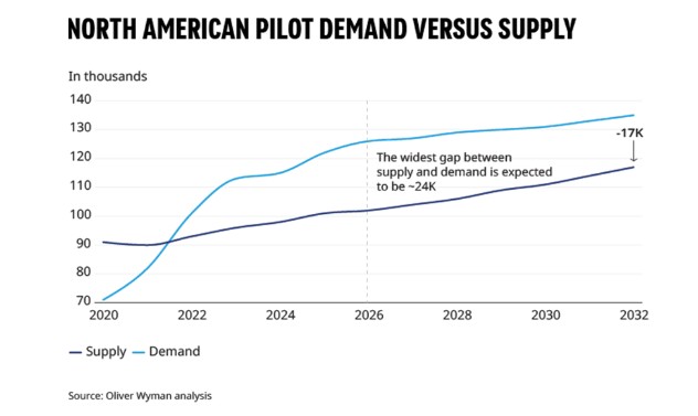 La consultora Oliver Wyman estima que a pesar de los esfuerzos para cerrar la brecha, las aerolíneas en América del Norte enfrentarán una escasez de casi 30.000 pilotos para 2032.