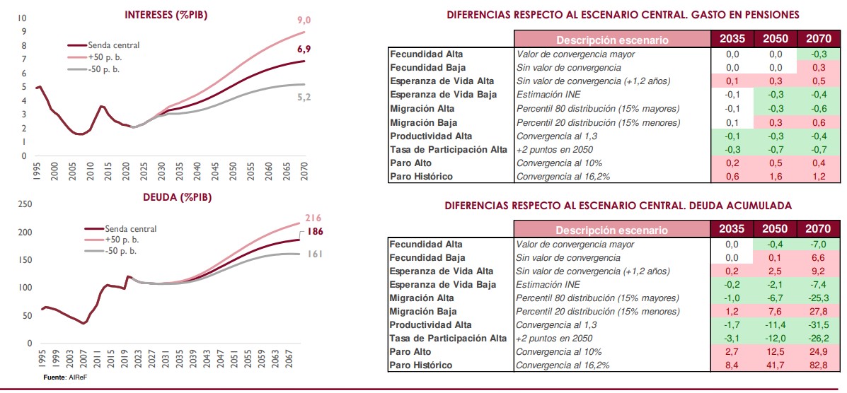 Al final, el resumen de estos dos apartados (que nosotros hemos llamado 3.1 y 3.2) es que no se anticipa ningún ejercicio con superávit en las próximas tres décadas (incluso más, pero nos quedaremos con las proyecciones hasta 2050). Salvo que algún Gobierno dé un golpe de timón muy importante y no realizado con anterioridad, España irá acumulando números rojos en sus administraciones públicas. ¿Lo podrá financiar? Si puede, será disparando la deuda pública (en el escenario central de la AIReF se va a cerca del 150% del PIB a mediados de siglo) y el gasto en intereses de la deuda, que podría tocar el 5% del PIB antes de 2050.