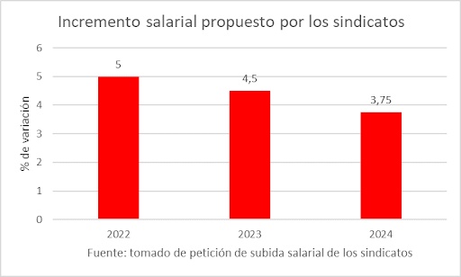 La propuesta de los sindicatos para incrementar los salarios hasta más de un 13% en un período de tres años, uno de ellos de manera retroactiva, es un elemento muy peligroso para la economía española, pues incrementarían enormemente los costes de las empresas, ya muy elevados debido al proceso inflacionista que vivimos, y presionarían más al alza a la inflación, dado que las empresas tendrían que repercutirlos en el precio de sus productos y servicios, pues no podrían soportar un quebranto de tal tamaño, que les haría cerrar, con consecuencias mucho más perjudiciales para la economía y el empleo.