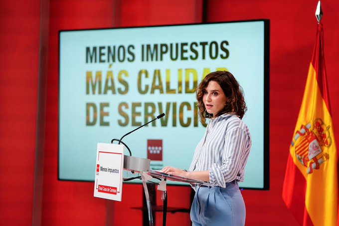 La presidenta Isabel Díaz Ayuso no sólo ha dado continuidad a dicha filosofía en materia tributaria, sino que la ha intensificado con medidas como la supresión de todos los impuestos propios o una rebaja histórica de medio punto en los tramos autonómicos del IRPF. En total, bajo su mandato se han aprobado veinte bajadas de impuestos en menos de dos años, desde las elecciones de mayo de 2021.