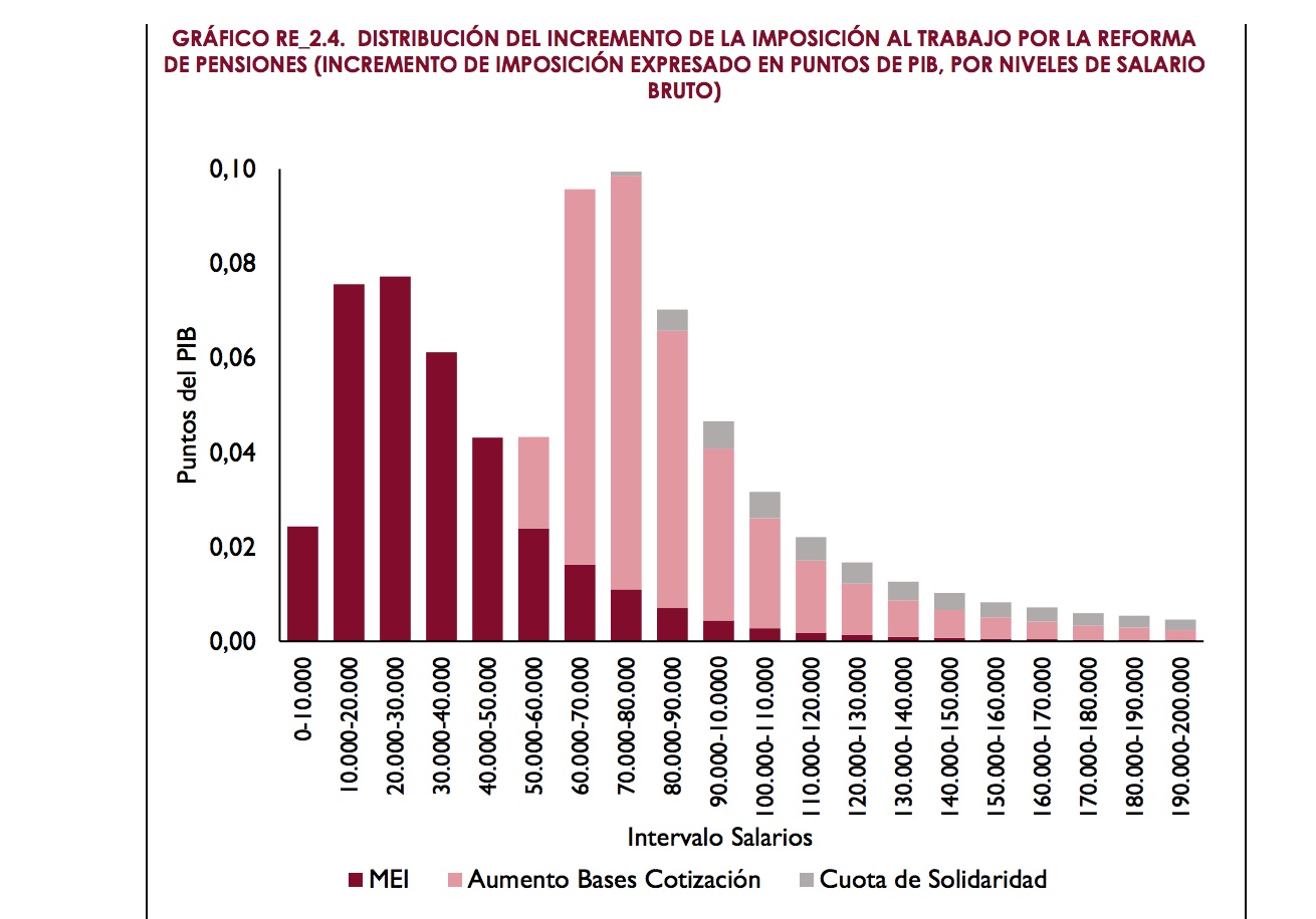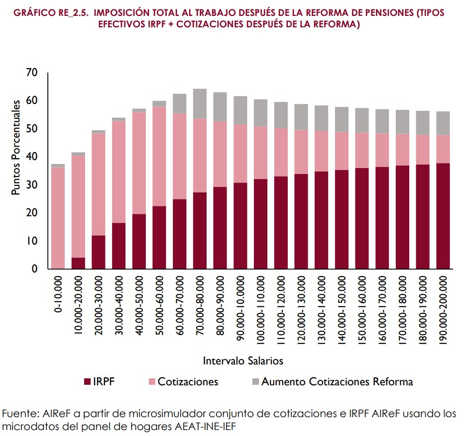 "La mayor proporción del incremento de gravamen recaerá sobre las rentas salariales superiores a 54.000 euros (un 65% del coste la reforma, esto es, 7.800 millones de euros de impuestos adicionales con los datos del PIB de 2022), debido fundamentalmente al aumento de las bases máximas de cotización. Por su parte, los salarios inferiores a 54.000 euros soportarán el 35% de la reforma ya que, aunque solo se ven afectados por el MEI, son el grupo más numeroso y en el que se concentran la mayoría de los salarios en España" explica la Airef.