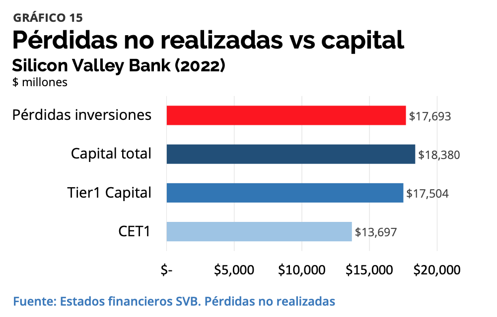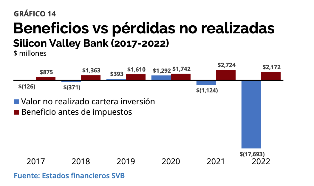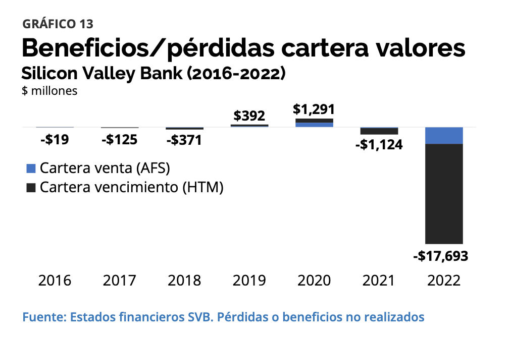 Con este escenario de fondo, el curso 2022 vino marcado por un súbito hundimiento en el valor de la cartera hasta vencimiento. Como explica Daniel Fernández, "quizá no hay gráfica que muestre de mejor manera las no liberalidades y los riesgos asimétricos que ocurren en el mundo bancario que la que vemos a continuación. En las finanzas no ocurre nada, hasta que ocurre. Y, cuando ocurre, el impacto es usualmente más fuerte por el lado negativo que por el lado positivo". Entre 2016 y 2021, la cartera se movió entre pérdidas por un monto de -1.124 millones de dólares y revalorizaciones por 1.291 millones. En 2022, el hundimiento fue de -17.693 millones.
