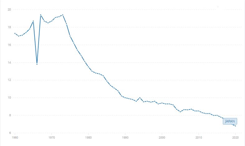 Este problema relacionado con la natalidad no es algo que afecte exclusivamente al país nipón en Asia. En Corea del Sur, con una tasa de fertilidad de solo un 0,78, se ha gastado un total de 200.000 millones en políticas de natalidad sin lograr revertir la tendencia. Y aunque la tasa de Japón es mayor, un 1,34 – recordemos que en España está en 1,19—, lleva demasiado tiempo disminuyendo. Así lo muestran los datos del Banco Mundial que vemos en el gráfico.