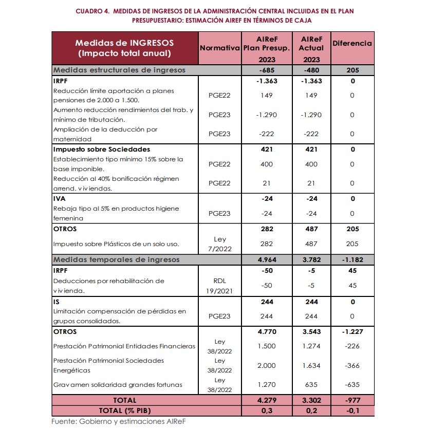 Además, el organismo constató que, pese al incremento esperado de recaudación, este sea menor el inicialmente estimado. Así, la AIReF prevé un punto de PIB menos de ingresos públicos que lo que estimaba en octubre. Y buena parte de este recorte se debe a las menores expectativas de recaudación de los impuestazos de Sánchez a las grandes fortunas, los bancos y las empresas energéticas.