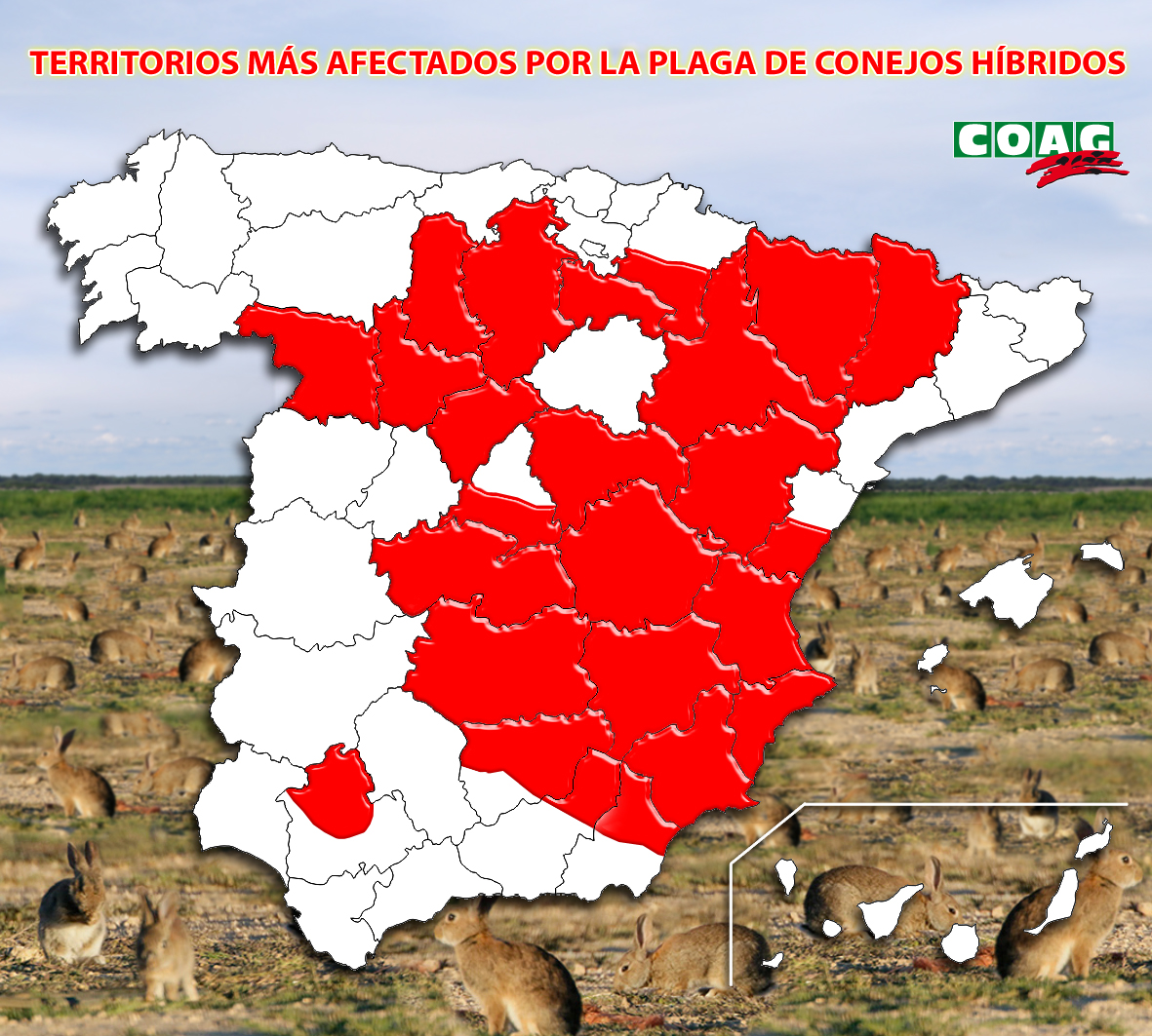 Una plaga de conejos híbridos nunca antes vista por los agricultores está arrasando sin piedad los cultivos y ya se ha extendido por diez comunidades autónomas afectando a más de 1.400 municipios. Según COAG, "un millón de hectáreas han sufrido algún tipo de daño y las pérdidas se elevan por encima de los 800 millones de euros". También denuncian que esta plaga de conejos híbridos "se ha convertido en un problema muy serio que a las administraciones se les ha ido de las manos."