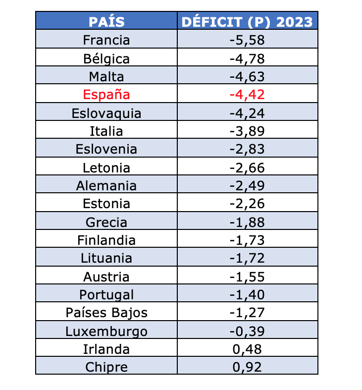 España es el cuarto país de la Eurozona con mayor déficit público, de acuerdo con las previsiones del Fondo Monetario Internacional para 2023. Solo presentan un descuadre presupuestario más abultado los gobiernos de Francia, Bélgica y Malta, mientras que otros quince países miembros del área monetaria única registran datos más favorables.