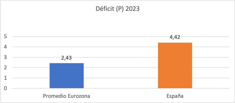 Si establecemos el promedio para el conjunto de los países de la Eurozona y lo comparamos con el dato de España, encontramos que hay una brecha muy significativa entre el desempeño de nuestra economía y el comportamiento que exhiben los demás miembros del área monetaria única. Así, el déficit medio en la Eurozona que espera el FMI para 2023 asciende al 2,43% del PIB, de modo que España se sitúa un 82% por encima.