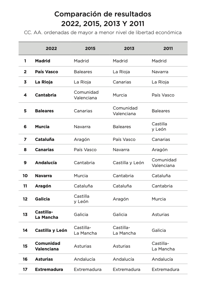 En base a esta completa evaluación, Madrid obtiene 0,289 puntos y ocupa la primera posición de la tabla, a diferencia de País Vasco y La Rioja, que completan el podio con una evaluación de 0,417 y 0,449 puntos, respectivamente. Cataluña obtiene 0,519 puntos, de modo que Madrid casi duplica sus niveles de libertad económica. Andalucía recibe 0,535 puntos y empieza a mostrar signos de mejora tras décadas de socialismo, mientras que Galicia logra 0,539 puntos. Las autonomías con peor resultado son Comunidad Valenciana (0,616), Asturias (0,635) y Extremadura (0,717).