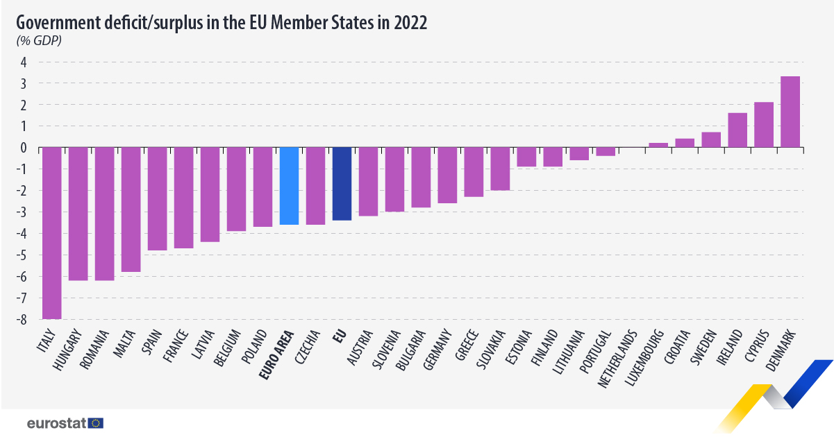 Atendiendo a los datos recién publicados por Eurostat, correspondientes al cierre del año 2022, se certifica que el déficit público de España se situó en el top 5 europeo. De esta forma, el descuadre entre ingresos y gastos se situó en nuestro país en 63.776 millones de euros, lo que equivale al 4,8% del PIB nacional. Únicamente Italia (8%), Hungría y Rumanía (ambos 6,2%) y Malta (5,8%) registraron déficits mayores que España.