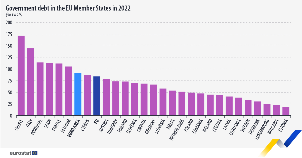 El ratio alcanzado por nuestro país se sitúa 21,6 puntos más encima de la media de la zona euro, que marca un 91,6% de deuda sobre PIB, además de 29,2 puntos más elevado que el promedio de la Unión Europea, que registra un 84%.