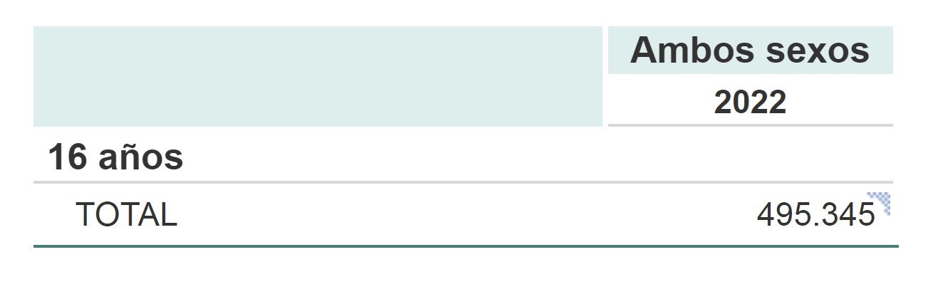 En España, según el INE como vemos en la tabla adjunta, había en 2022 un total de 495.345 personas con 16 años. Es decir, en el hipotético caso de que Sumar pudiera implantar tal idea para 2024, habría que destinar la ingente cantidad de 9.907 millones de euros, lo que supone 1,83 veces el patrimonio de Sandra Ortega, 2,6 veces el de Rafael del Pino y casi 3 veces el de Juan Roig.
