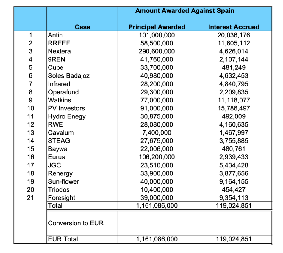 Repasando los 21 procedimientos que se han resuelto en contra de España, encontramos otras obligaciones de pago por intereses muy significativas: 15,8 millones a PV Investors, 11,6 millones a RREEF, 11,1 millones a Watkins, 9,4 millones a Sun-flower, 9,4 millones a Foresight…