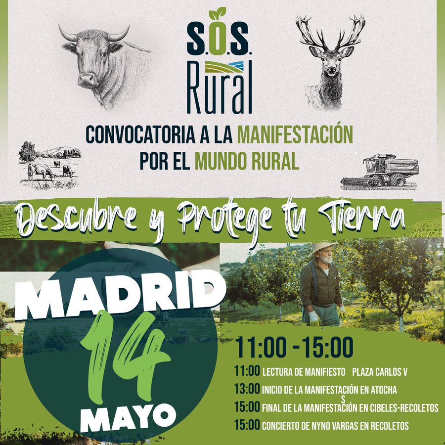 SOS Rural, la plataforma nacional que ha conseguido unir a cientos de asociaciones españolas del mundo rural y el sector primario ha dado a conocer el recorrido de la manifestación de este domingo 14 de mayo en Madrid para protestar contra las "leyes radicales, animalistas y ecologistas" del Gobierno de Pedro Sánchez, en palabras de su portavoz Carlos Bueno.