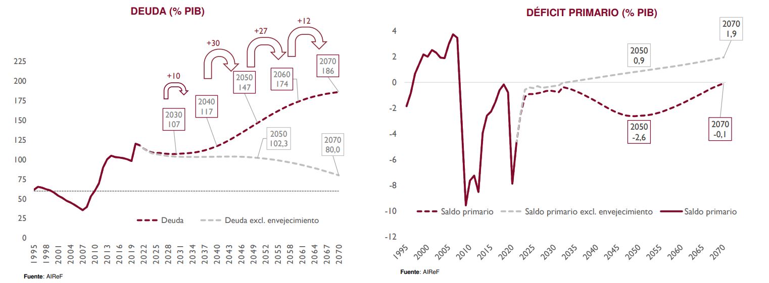 Y, por último, señala al desmesurado gasto en pensiones como uno de los principales causantes de que el ratio de deuda pública vaya a volver a dispararse desde el año 2030, pudiendo alcanzar el 186% del PIB en 2070.