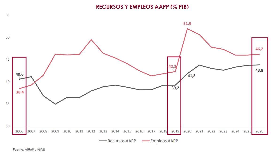 Además, la AIReF muestra una gran preocupación por la situación "vulnerable" de las finanzas públicas y el "persistente desequilibrio fiscal". En este sentido, el organismo independiente recuerda que el gasto público se consolidará en los próximos años sustancialmente por encima de los niveles prepandemia, dificultando una rápida corrección de los niveles de endeudamiento.