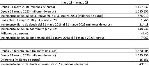 O dicho de otra manera, Sánchez incrementa la deuda cada minuto en 148.736 euros.