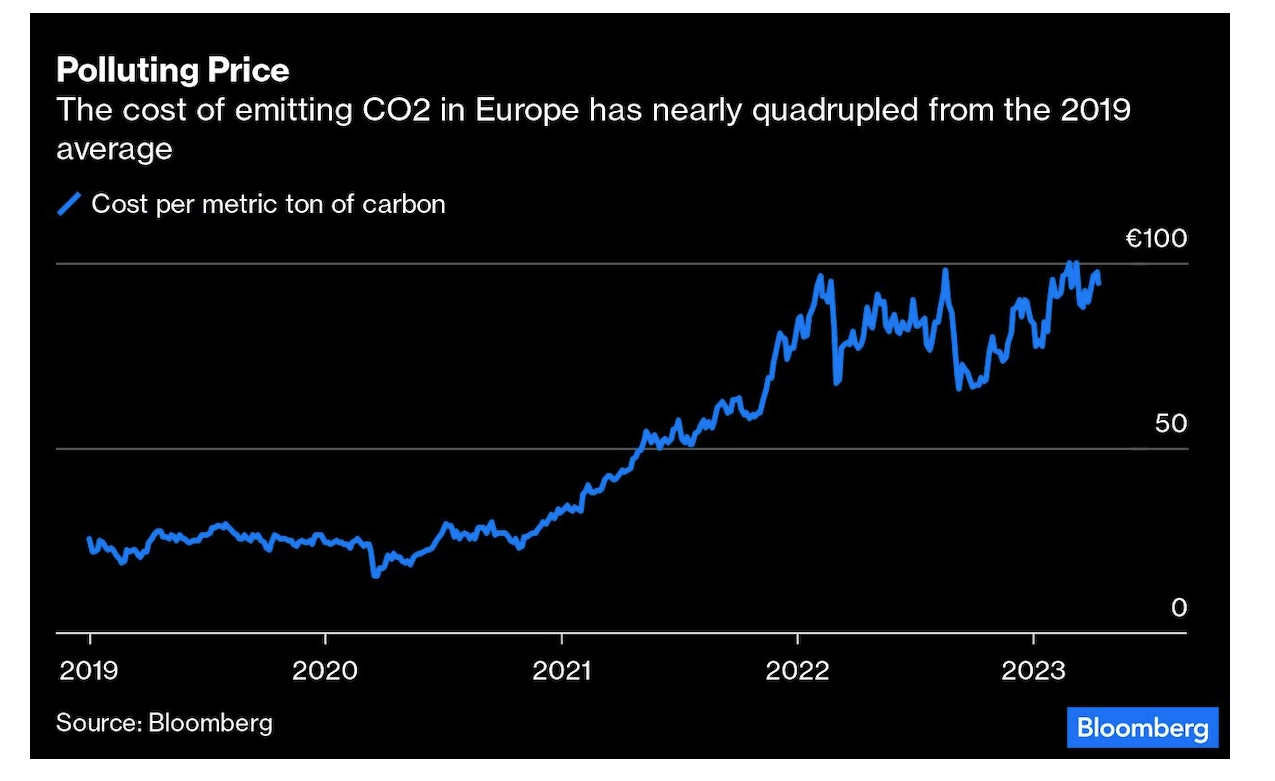 Las políticas climáticas han sido el primer factor que ha influido en este desarrollo. Como puede verse en el siguiente gráfico de Bloomberg, el coste de los derechos de emisiones de CO2 se ha cuadruplicado entre 2019 y 2023. En la práctica, esto encarece de manera directa el presupuesto de las aerolíneas y obliga a las compañías a elevar precios para esquivar las pérdidas.