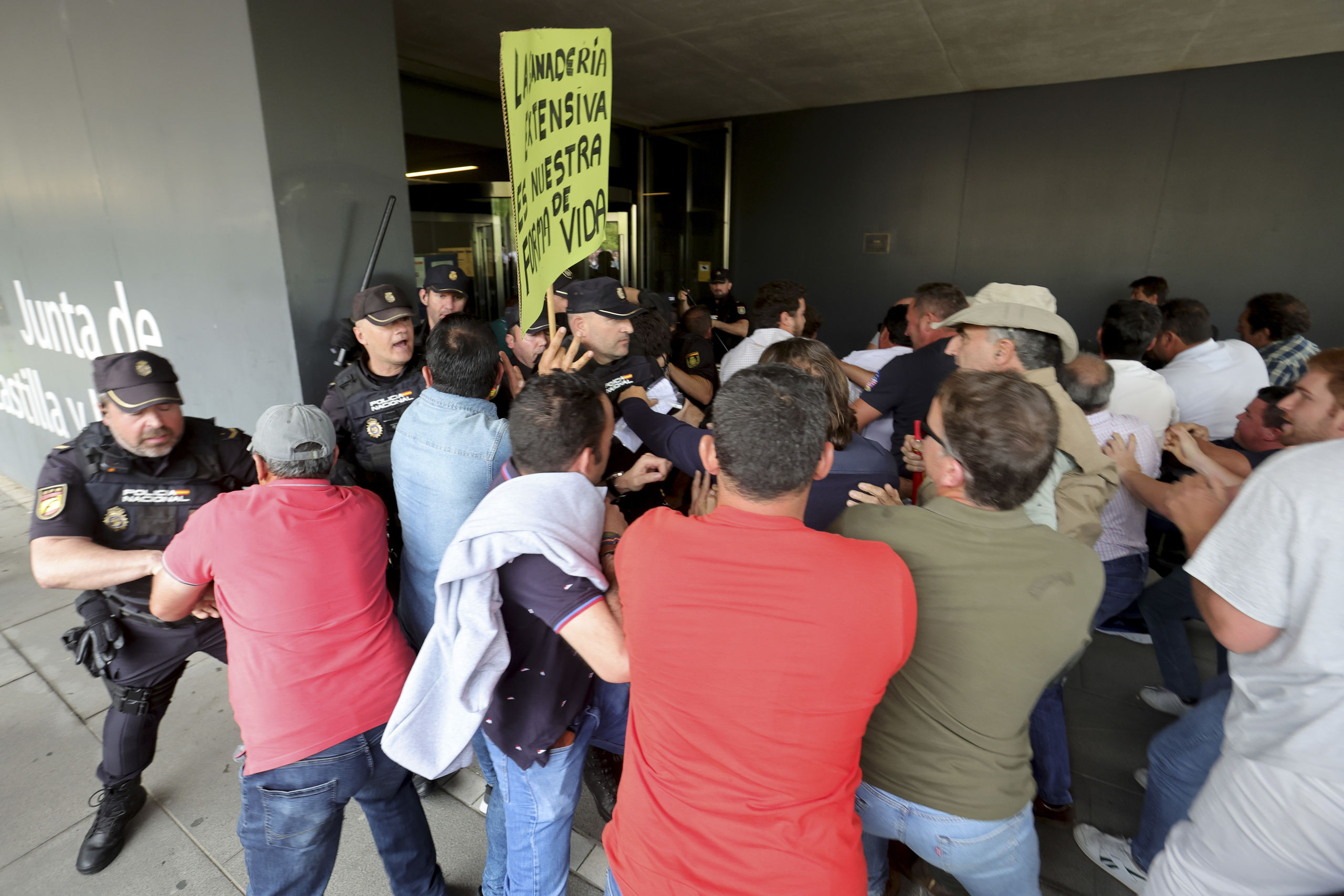 Media hora después de empezar la protesta, en torno a las 13:00 horas, varios representantes de la organización convocante, Unión por la Ganadería, procedían a entrar en las instalaciones de la Junta para reunirse con el delegado de la Junta. En ese momento, decenas de los presentes han intentado acceder también y han comenzado a golpear los cristales con vallas y bastones.