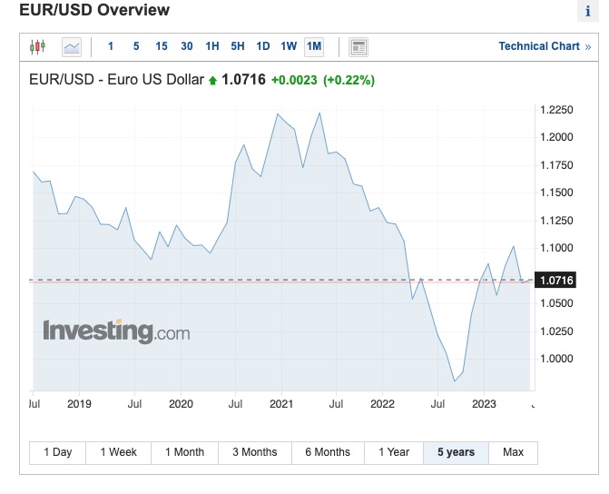 Si observamos el comportamiento del euro/dólar durante los últimos años, contemplamos una caída del euro que tuvo como su peor momento el verano de 2022. Momento en el que las subidas de tipos de interés y, fundamentalmente, la retirada de los programas de recompra de deuda pública hacían especial daño a países muy endeudados, como los casos de España e Italia.
