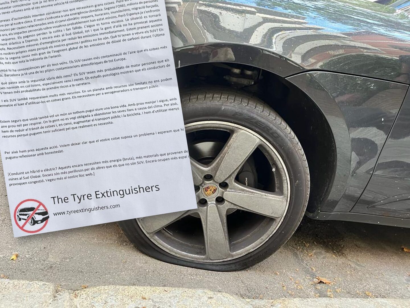 La nota, firmada por The Tyre Extinguisher, reconoce que su fin es "hacer que tener un gran 4x4 contaminante en áreas urbanas sea imposible" y que el acto delictivo está justificado por defensa propia, "contra el cambio climático, la contaminación del aire y la conducción peligrosa".