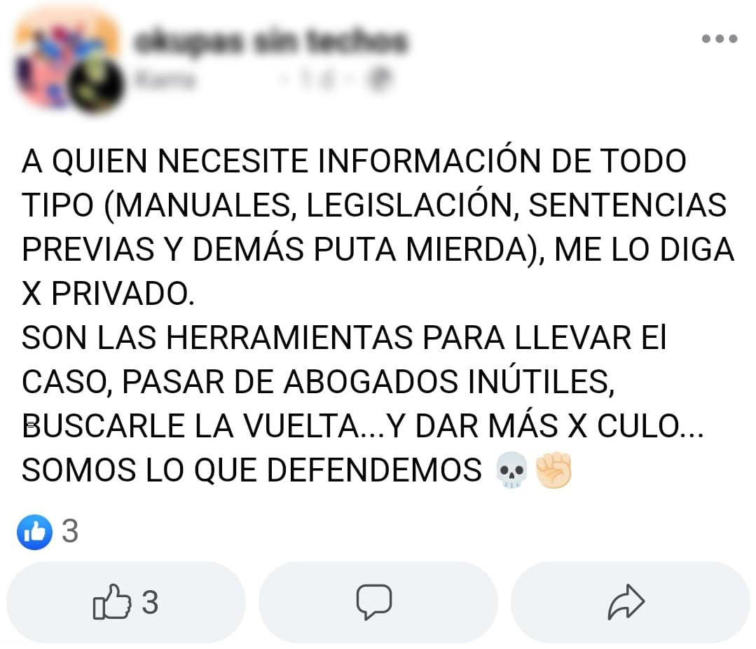 Y, en todos estos grupos, siempre hay un roto para un descosido: gente dispuesta a facilitar manuales de okupación, legislación y sentencias previas para presentar alegaciones en caso de tener que enfrentarse a un proceso judicial y “pasar de abogados inútiles". La impunidad es tal que no esconden su objetivo: “Dar más x culo".