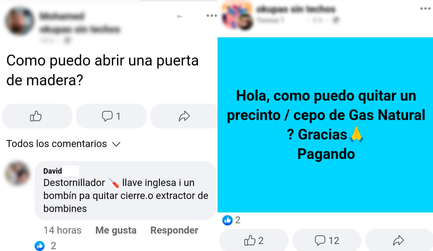 Entre las preguntas más frecuentes, no obstante, se encuentran cosas mucho más inmediatas, como la mejor forma de abrir una puerta o “quitar el precinto/cepo de Gas Natural", algo no exento de riesgos. No en vano, una de las principales denuncias de los vecinos -víctimas indirectas de la okupación- es que nadie calibre el peligro que este tipo de prácticas tienen para todos.