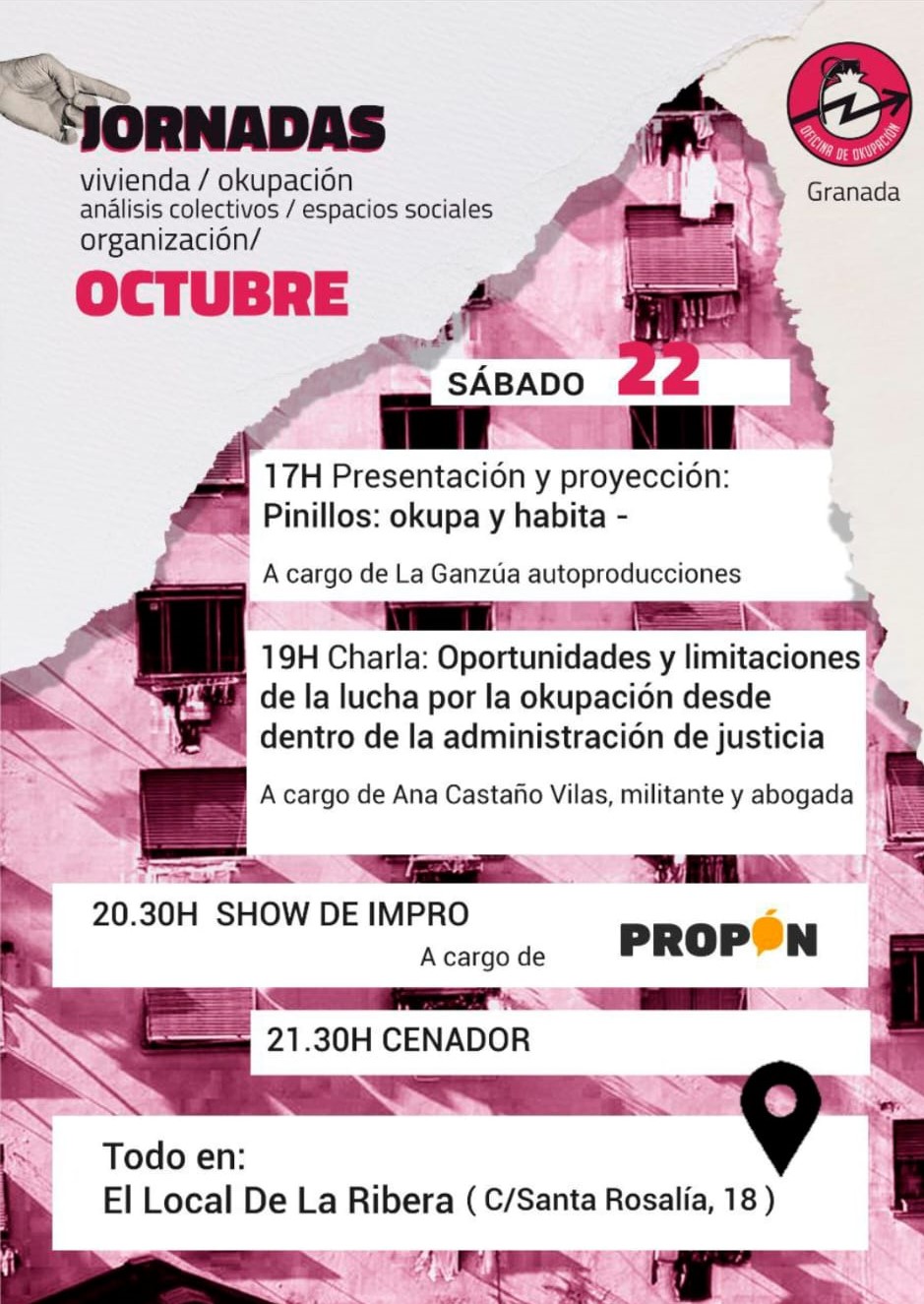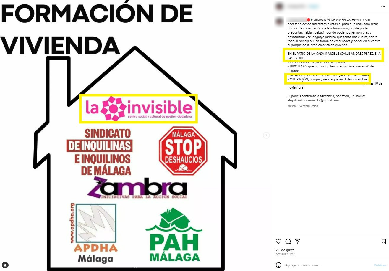 Las “jornadas de formación" son fáciles de encontrar en redes sociales. Se celebran en toda España. En este caso, en Granada, donde el pasado mes de octubre se proyectó el documental “Pinillos: okupa y habita" y donde incluso una abogada y “militante" expuso las “oportunidades de la lucha por la okupación desde dentro de la Administración de Justicia", lo que demuestra hasta qué punto los poderes públicos se han desentendido de una lacra que afecta a miles de víctimas directas e indirectas en toda España.
