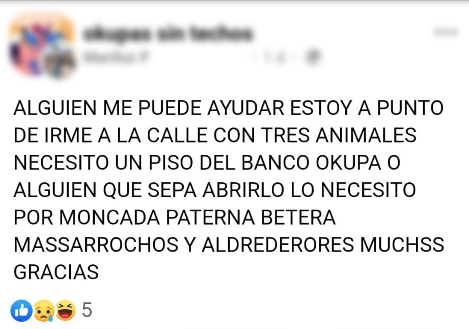 Lo más extendido, no obstante, son los anuncios de gente que busca piso, ya que las mafias prefieren no tomar la iniciativa, sino responder por privado a quien reclama una vivienda para okupar. Lo más habitual es preguntar por alguno que pertenezca a un banco, puesto que así el desahucio puede retrasarse mucho más tiempo. Hay mensajes de familias con niños, pero también otros, como el de esta señora, que busca no quedarse en la calle “con tres animales”.