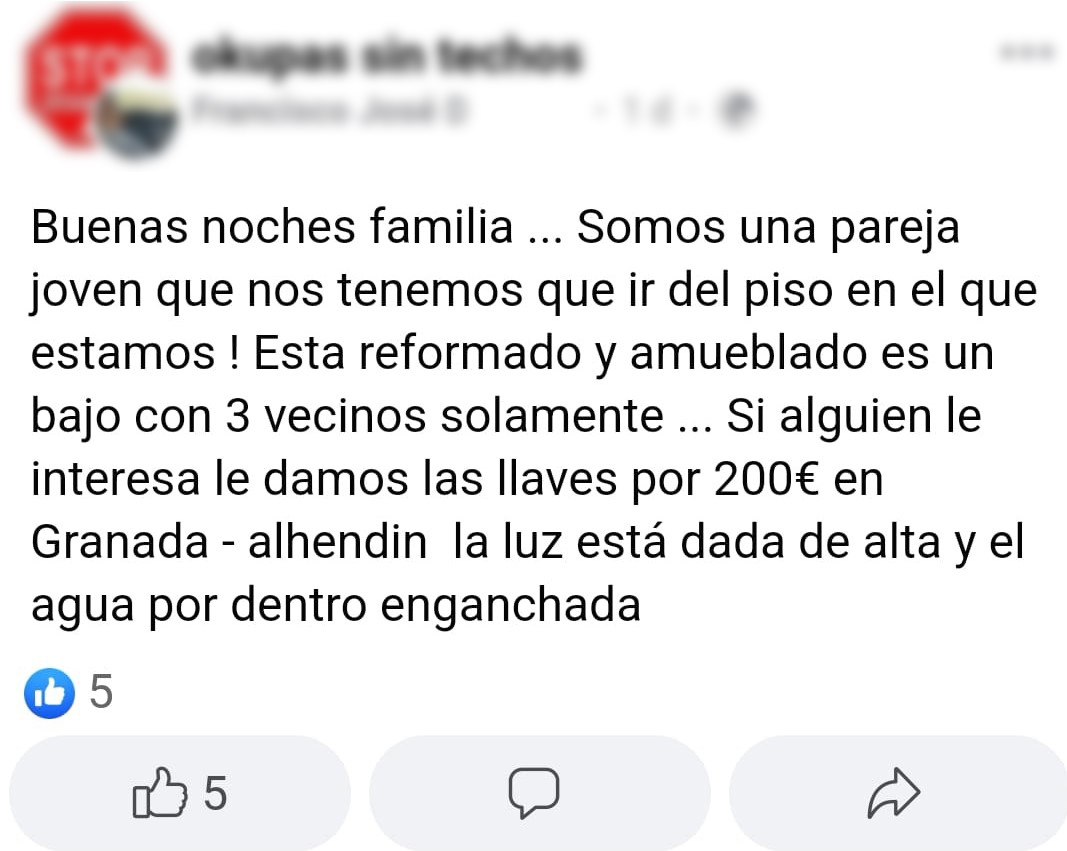 Redes sociales como Facebook están repletas de grupos que promueven la okupación, como es el caso de Okupas sin techo. En ellos, es fácil encontrar anuncios de mafias o particulares que venden pisos que no son suyos. En este caso, una casa en la playa por 600 euros y con contrato falso “para alargar el desalojo" mientras el juez practica las diligencias pertinentes en caso de denuncia.