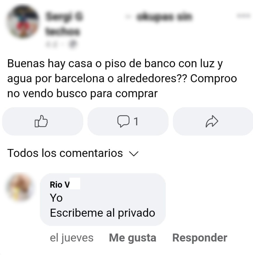 Este otro anuncio es el claro ejemplo de cómo mafias o particulares tratan de evitar la sobreexposición, instando al interesado a escribirle por privado. Aunque según denuncia la Plataforma de Afectados por la Ocupación, estas prácticas no se persiguen, llegado el caso, es más difícil que el juez les pueda imputar un delito.