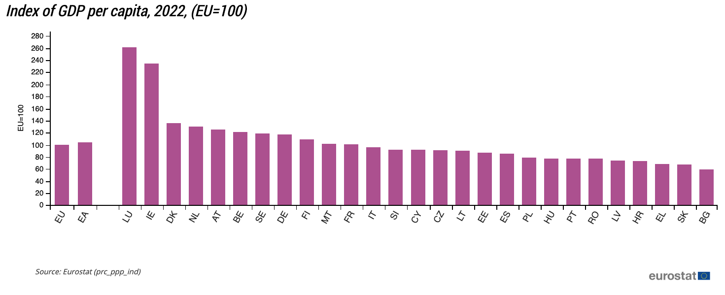 Aunque el tamaño de nuestra economía es el cuarto más grande de la UE, lo cierto es que, en términos de PIB real per cápita, Estonia viene de superar recientemente a España, lo que nos ha relegado al puesto 18 de un total de 27 economías. Lo vemos en el siguiente gráfico, elaborado por Eurostat, la oficina estadística de la UE: