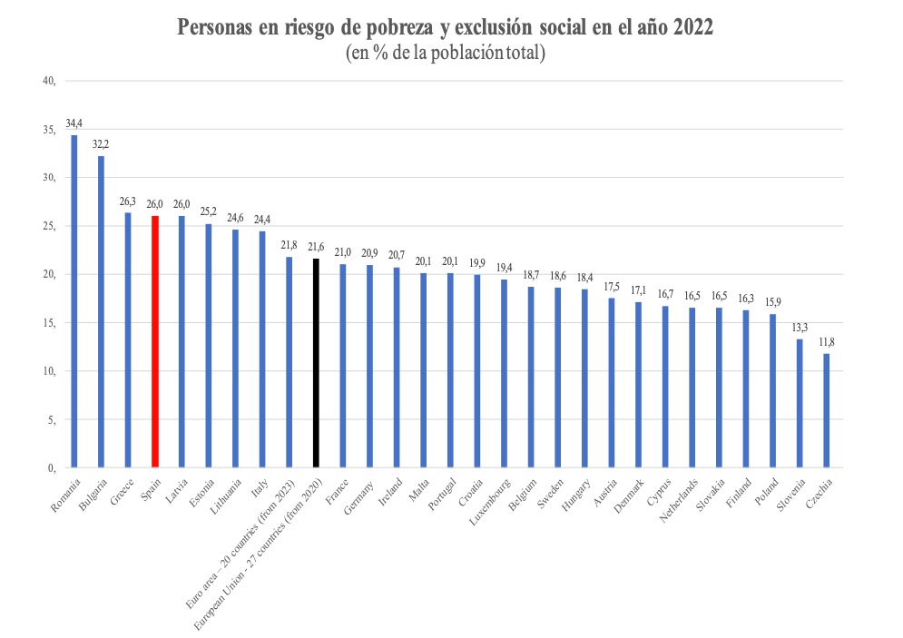 El informe realiza un repaso demoledor de la gestión económica de Pedro Sánchez que no sólo ha resultado nefasta para el poder adquisitivo medio de los hogares –"la variación del PIB per cápita en términos reales contempló un empeoramiento aún mayor. Cayó un 6,6 por 100, la mayor contracción de esa variable a la que sólo se acerca Eslovaquia"– sino que también lo ha sido para los más vulnerables –"España es el cuarto país de la UE con un mayor porcentaje de personas en riesgo de pobreza o exclusión social. En esa situación se encuentran el 26 por 100 de los españoles, nivel sólo superado por Rumania (34%), Bulgaria (32%) y Grecia (26,3%). "–. Y "esto no es "ir como una moto", concluye el informe.