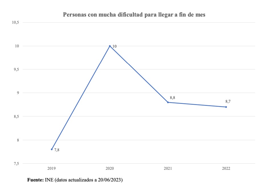 El estudio destaca que "la coalición gubernamental hizo de su lucha para mejorar las condiciones de vida de los individuos y de los hogares menos favorecidos uno de los ejes de su actuación. Para ver lo ocurrido durante la presente Legislatura es útil recurrir al concepto de Carencia Material Severa (CMS) elaborado por el Instituto Nacional de Estadística. Este es el indicador más cercano a lo que puede calificarse de pobreza". Pues bien, "tras haber alcanzado su nivel más bajo en 2019, se disparó a raíz de la pandemia y el cierre de la actividad económica para mantener una tendencia alcista hasta 2022. En ese año, el número de pobres existente en España se sitúa más de 3 puntos por encima del que existía al comienzo de la presente Legislatura y superior al punto máximo alcanzado, 2014, durante la Gran Recesión".