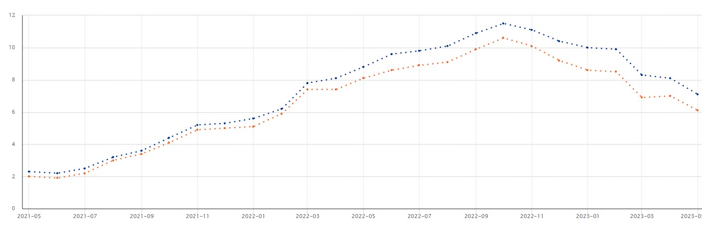 La inflación continúa enquistada en Europa. El IPC del Viejo Continente lleva más de un año en niveles históricamente altos, lo que está suponiendo una grave erosión de la riqueza y el ahorro de sus ciudadanos. Fue el pasado mes de mayo cuando los precios europeos cerraron con una subida del 6,1%, una cuantía ligeramente inferior al 7% en el que terminaron abril, pero que supone triplicar el objetivo último del BCE: "El 2% a medio plazo".