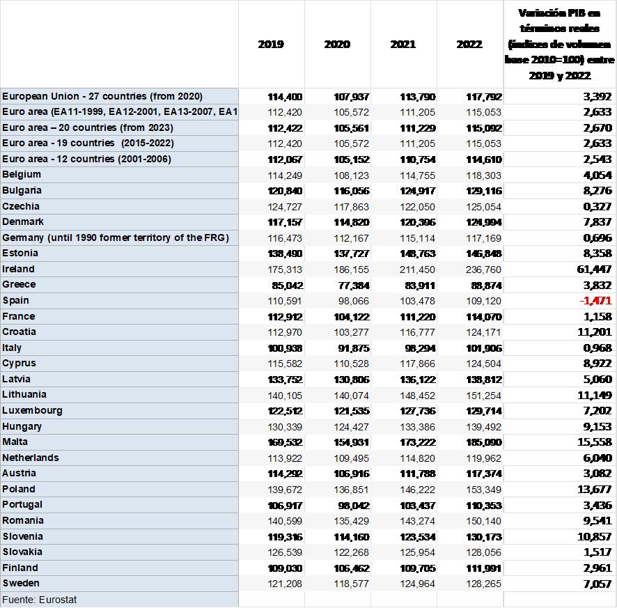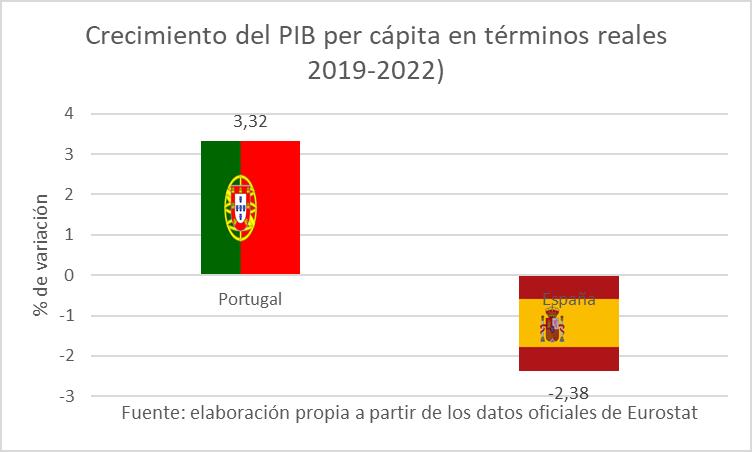 Eso hace que desde el momento anterior a la pandemia, Portugal ha visto cómo su PIB per cápita en términos reales crece un 3,32% entre 2019 y 2022 (último dato publicado) y España retrocede un 2,38% en ese mismo período. Es decir, Portugal aumenta su riqueza y España la disminuye.