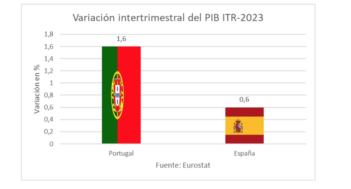 Crecimiento del PIB intertrimestral: Portugal crece el triple que España en el ITR-2023. Así, crece un 1,6% frente al 0,6% español.