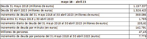 O visto de otra manera: en el primer año, la deuda se incrementaba a un ritmo de 105,99 millones de euros al día. Ahora, tras casi cinco años de Gobierno de Sánchez, la deuda crece 205,62 millones de euros cada día.