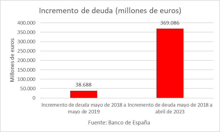 Todo ello, nos lleva a que desde que gobierna Sánchez la deuda se ha incrementado en 369.086 millones de euros. Durante el primer año, aumentó en 38.688 millones, y al cabo cuatro años de mandato el incremento es casi 370.000 millones de euros, según las notas mensuales iniciales publicadas por el Banco de España sobre la deuda de las AAPP.