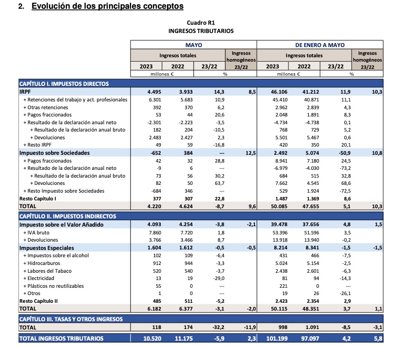 El informe detalla este aumento en la extracción de impuestos. "Los ingresos homogéneos por el IRPF crecieron, hasta mayo, un 10,3%", apunta el último informe de recaudación oficial. "El mes de mayo no ofreció muchas novedades respecto al comportamiento de la recaudación en los meses anteriores. Los ingresos homogéneos acumulados pierden un par de décimas con respecto al dato hasta abril, pero esa pequeña moderación se debe al comienzo de la campaña de renta en la que se espera un aumento de las devoluciones", señala el estudio. "Las retenciones del trabajo, que son el componente de más peso en el impuesto, continúan creciendo con intensidad, incluso a pesar de las medidas normativas. Estas medidas restan alrededor de 8 décimas al crecimiento de los ingresos en el conjunto del impuesto", explica el informe. Pero, lo cierto es que el cobro de impuestos pasa de 41.212 millones para el periodo enero-mayo de 2022 a un total de 46.106 millones para los mismos meses de 2023.