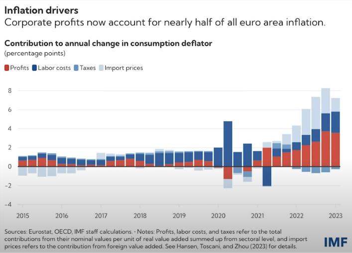 El estudio de los tres economistas del FMI afirma y concluye que la inflación vivida en los dos últimos años se canaliza en un 45% en aumentos de los beneficios empresariales, un 40% en mayores precios de importación y por último y de momento, un 15% de aumento de los salarios.