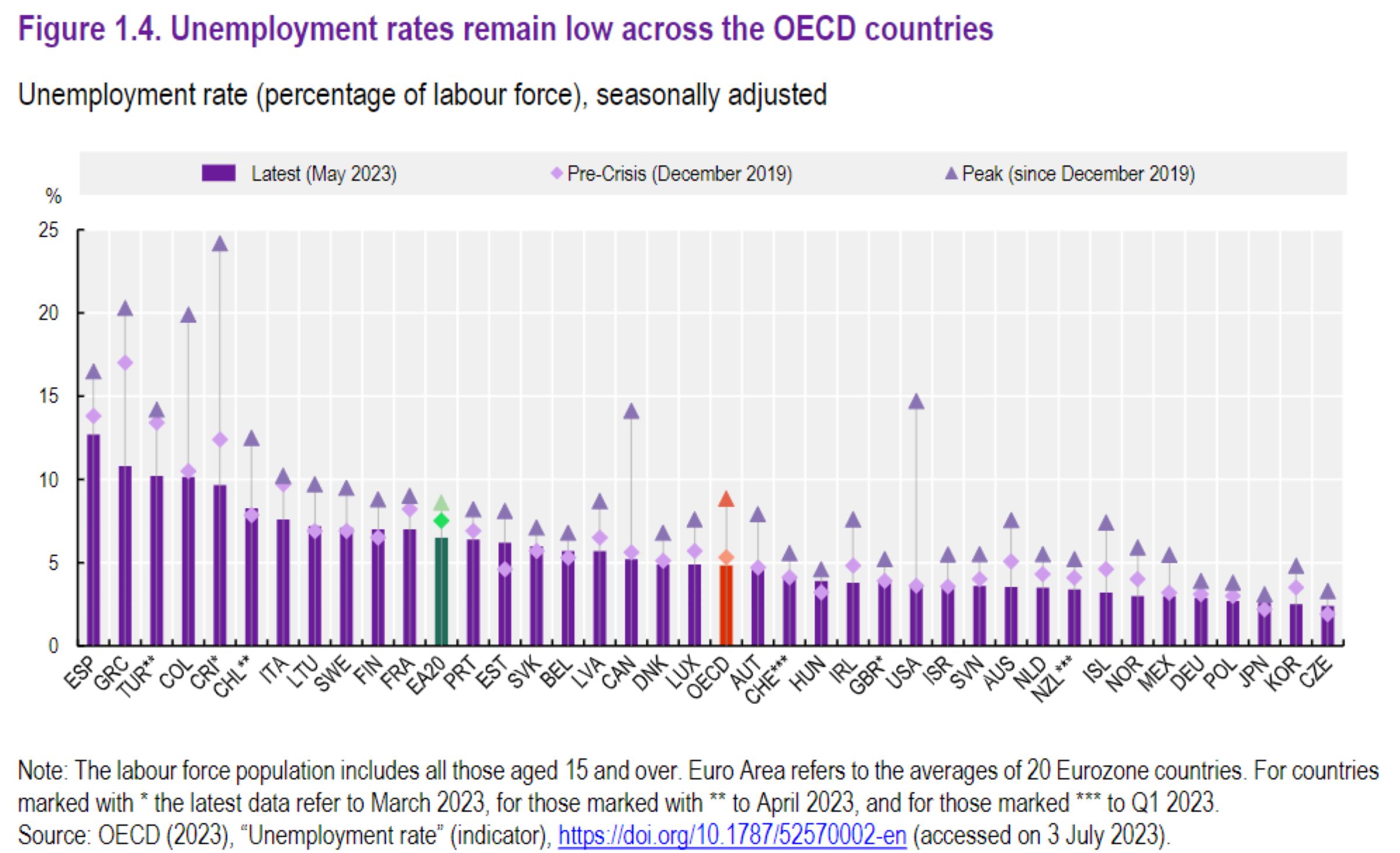 Así lo ha publicado este martes, la OCDE en su informe anual sobre perspectivas de empleo. España tiene una tasa de desempleo del 12,7% muy lejano al 4,8% que registra el conjunto de la OCDE. De este modo, España supera a países como Grecia o Turquía. Se prevé, además, que para el resto del 2023, este porcentaje se mantenga aún bastante alto, descendiendo solamente hasta el 12,6%.