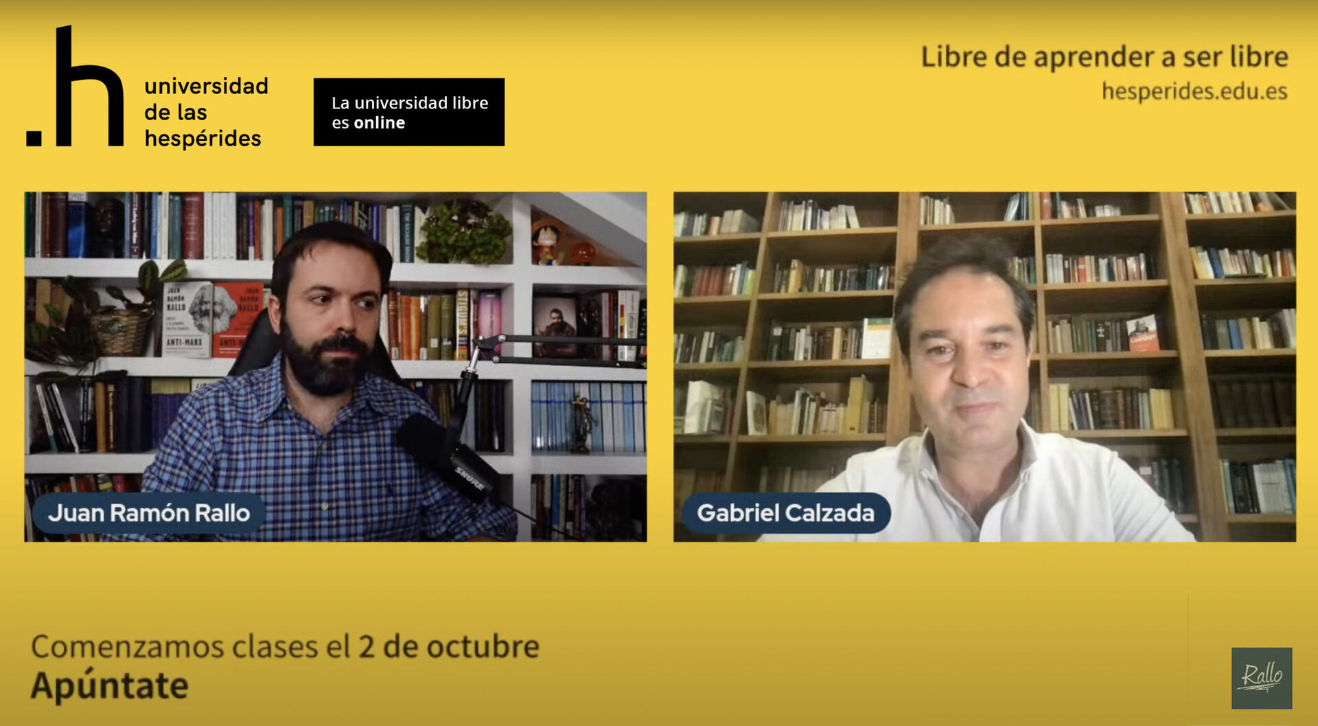 "¿Cómo funcionaría la educación en una sociedad libre?" ha sido el título de una conversación entre Juan Ramón Rallo y Gabriel Calzada, presidente de la Universidad de las Hespérides, que se emitió por el canal de YouTube del economista, así como en otras redes sociales en las que está presente, como Twitter y Twitch. Durante el encuentro se pudo conocer la génesis de este nuevo proyecto educativo, que busca estar "abierto al diálogo, a las visiones diferentes, contrapuestas" y que está pensado "para gente curiosa", según subrayó su máximo responsable.