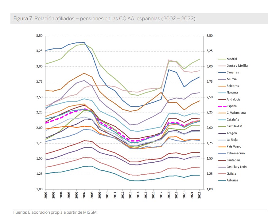 Este documento muestra como, en las cuatro comunidades autónomas del noroeste del país (Castilla y León, Galicia, Asturias y Cantabria), menos de dos trabajadores sostienen a cada uno de sus pensionistas (todas se sitúan por debajo del 1,75 con Asturias claramente por debajo de un preocupante 1,25). Bien es cierto que una mitad de comunidades y las ciudades autónomas superan el valor de 2 en su ratio afiliados-pensiones, con Madrid, Ceuta y Melilla y Canarias claramente "alrededor de un saludable nivel de 3" señala el documento. Sin embargo, esto significa que si el sistema de pensiones estuviese íntegramente transferido a las comunidades autónomas, las cuatro regiones del cuarto noroccidental sufrirían "desequilibrios severos que les impedirían, seguramente, cumplir sus compromisos de pensiones" reza el texto.